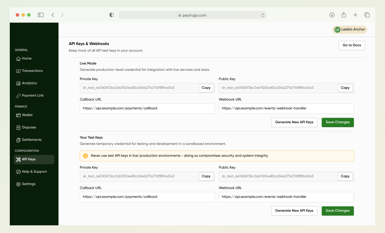 For developers and platforms integrating with Paytrugo, this page allows generating and managing API keys. Different key types provide tailored access for reading transaction data, facilitating payments or triggering payouts from managed accounts.